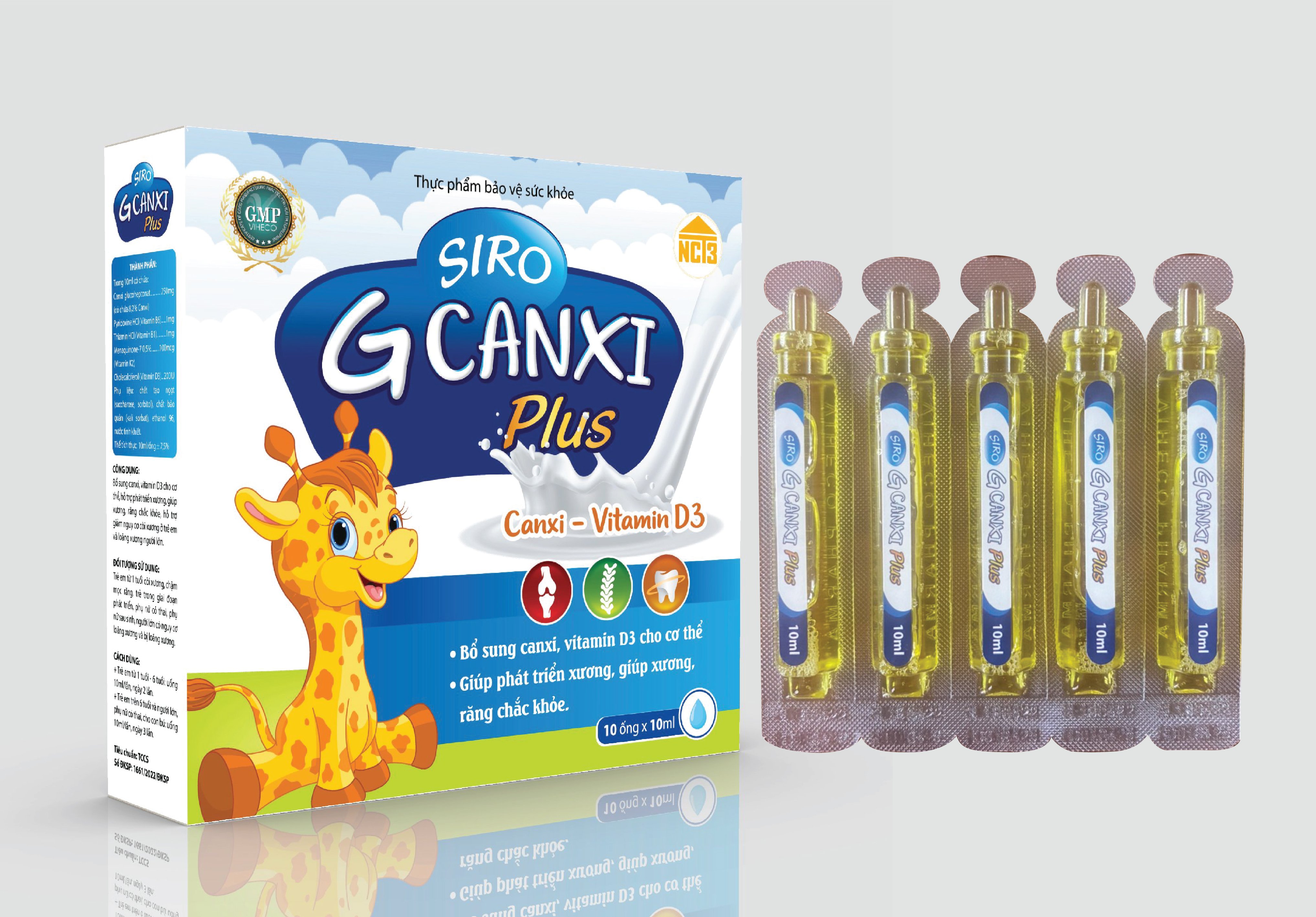 Siro Gcanxi Plus của NCT3 Là sản phẩm giúp Bổ sung canxi, vitamin D3 và khoáng chất cần thiết cho cơ thể khoẻ mạnh. Khắc phục chống còi xương giúp cho xương, răng chắc khoẻ, trẻ bị suy dinh dưỡng, tiêu hoá kém, không hấp thu được dưỡng chất, hay ốm vặt, đêm trần trọc khó ngủ, ngủ không ngon giấc. Trẻ em ra mồ hôi ở chân, tay, toàn thân. Phụ nữ mang thai, hoặc sau sinh, trong thời kì kinh nguyệt, thiếu canxi, người bị gãy xương. Ngăn ngừa loãng xương cho người lớn tuổi. Siro Gcanxi Plus của NCT3 Có thành phần chủ yếu là Canxi glucoheptonate là một dạng canxi hữu cơ nguyên liệu từ pháp, tan hoàn toàn trong nước, được hấp thu tốt trong cơ thể. Không lắng cặn, không tạo sỏi, táo bón cho cơ thể. Vì khi có hiện tượng dư thừa, không được hấp thu, canxi glucoheptonate dễ dàng được đào thải qua đường tiểu. Ngoài ra còn chứa thành phần MK7 và VitaminD3 giúp hấp thụ canxi vào cơ thể nhanh nhất, Mk7 tối ưu hóa cách gắn Canxi cho xương cấu trúc và tăng lượng Collagen trong xương, nó được điều chỉnh để Canxi đến đúng chỗ cần là xương, và không đi đến những chỗ khác. Cách dùng: Trẻ em 1 tuổi – 6 tuổi: uống 1 ống, ngày uống 1-2 ống. Người lớn : ngày uống 3 lần mỗi lần 1 ống. Người bị loãng xương: uống 4 ống, chia 2 lần uống. Uống trước khi ăn 30p. Bảo quản nơi khô thoáng, tránh trực tiếp ánh sáng ? LƯU Ý: Thực phẩm này không phải là thuốc không có tác dụng thay thế thuốc chữa bệnh.